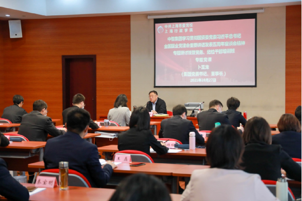 2021年10月26日,中智集团党委书记、董事长卜玉龙在上海市委党校(上海行政学院)为参加中智集团学习贯彻国资委党委习近平总书记全国国企党建会重要讲话发表五周年学习座谈会精神专题研讨班暨党务、纪检干部培训班全体学员,作了题为《提高政治站位,把握时代要求,切实提高国企党建质量》的党课辅导,他指出,要持续深化学习贯彻习近平总书记全国国企党建会重要讲话精神,按照国资委党委“八个牢牢把握”相关要求,扎实做好集团改革发展和党的建设各项工作,巩固扩大工作成果,全面提高党的建设质量水平,更好引领保障高质量发展。集团总经理助理,中智上海公司党委书记、副总经理李双主持。